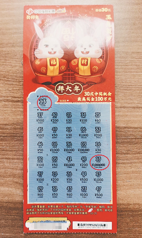 生活报讯 (记者李丹) 6日,哈尔滨市的张先生(化名)喜中“癸卯兔”系列即开型福利彩票刮刮乐中的30元面值票种“玉兔贺岁”一等奖,票面奖金100万元。恰逢该票种派奖,单张兑取100万元的彩票中奖者,额外派送50万元固定奖金,因此,张先生共计中得奖金150万元。