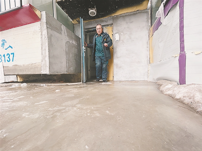9日下午,记者在现场看到,返出的水在三个单元门口已经形成了近40平方米的冰面,居民在冰面上铺上简单的木板,一个车库还在往外流清水,物业工作人员正在进行疏通。