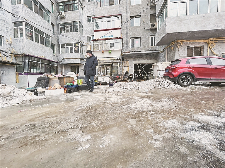 居民刘先生告诉记者,他家院内一单位车库往外返脏水持续近一个月,现在在三个单元门口形成了很大一片冰包路,导致居民出行非常不便。为防止滑倒,居民找来木板铺在冰上,最近两天,冰都要给单元门冻上了,他向车库产权管理人员反映多次也未解决。