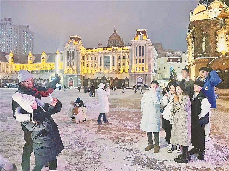 在哈尔滨索菲亚广场,游客成群结队拍照留念。记者看到,来自广州的齐女士和朋友视频后惊呼:“她真的以为我去了欧洲!”索菲亚广场每天都有国内外游客前来观光,尤其是雪后,美景让人流连忘返。来自布鲁塞尔的游客,努力用中文向周围的游人求助:“帮我拍些照片,我要发给朋友,推荐他们冬天一定要来哈尔滨看冰看雪!”