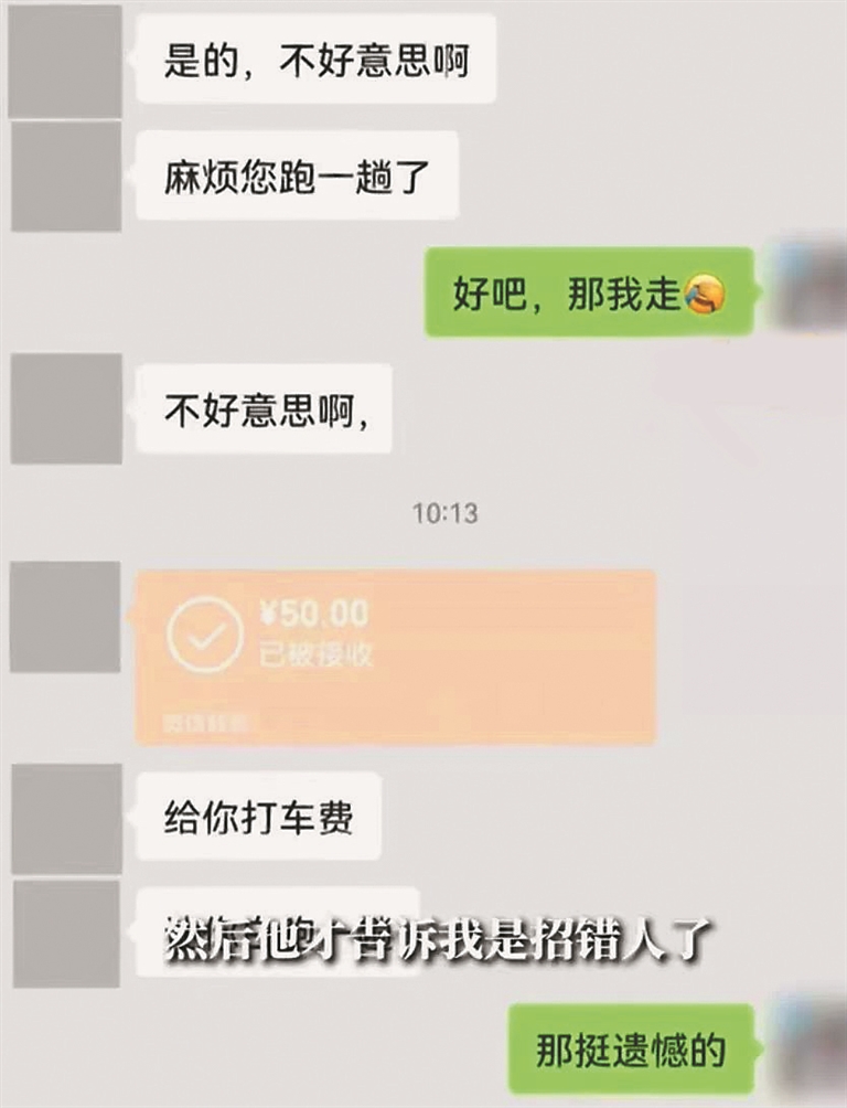 吴先生表示自己的专业是视频剪辑,去公司面试的岗位也是剪辑岗位。当天下午面试完,HR告诉被录取了,期待薪资7000元,公司录取后给7500元。随后,他们约好了入职时间。当天在公司待了一个多小时,人事才来找吴先生说,名字对不上,招错人了。“他们要招的是编导,不是剪辑,一直在说抱歉,补偿了50元打车费”,吴先生说。