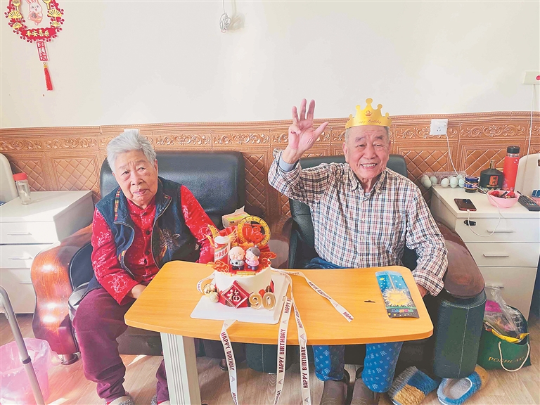 90岁的于大爷和89岁的杨大娘,这几年一直居住在德众养老院,两人相濡以沫,生活非常愉快。2月14日恰好是于大爷的生日,当天,家里人给他送来了生日蛋糕,听说当天是个浪漫的日子,年轻人都要送花、巧克力,时尚的于大爷也想跟老伴浪漫一次。