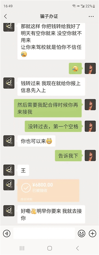 小宋告诉记者,自己是在2020年报名的,当时他通过广告认识了飞达驾校的一名教练,教练建议他报VIP班,拿证比较省事,所以费用会稍微高一点。小宋说:“当时飞达驾校的教练说报这个班,考试的时候能照顾,好拿证,我就报了,用微信把学费转给教练了。”交完6800元学费后,教练让小宋等着,会通知他上课和考试的时间。但过了好几个月,仍然没有人通知上课。小宋便向教练询问何时能拿证,教练一直都是让他再等等。后来小宋得到消息,自己联系的教练辞职了。