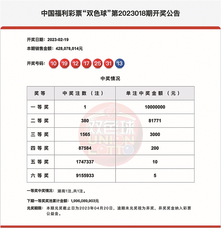 2月19日晚,中国福利彩票双色球游戏第2023018期开奖,本期开奖号码是:红色球号码:10、12、17、19、25、31,蓝色球号码:13。