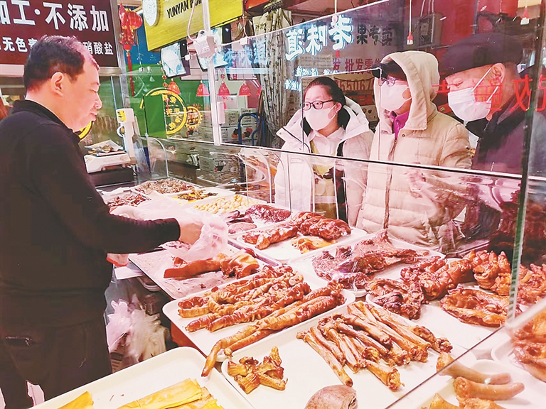 道里菜市场有一家“现做鲜卖”的老味道传统熏酱店,虽然玻璃橱窗内摆放着烧鸡、肥肠、酱牛肉等琳琅满目的各色卤味,但特价36.8元/斤的猪头肉最受欢迎,鲜香味道引得市民纷纷前来抢购。店内负责人称:“猪头肉最近卖得都挺火,一天300斤都不够卖,来晚了还抢不到嘞,这烟火气啊,彻底回来喽!”