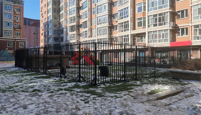 当日,记者来到电力物资公寓小区看到,小区不大,几个楼围成了一个小院子,这块空地就在楼中间。空地面积不算很大,一侧有一些健身器材,另一侧,大约空地的一半,都被用黑色的铁栅栏圈了起来,地面铺着绿色的软质材料,里面放着一个儿童滑梯和几个轮胎,铁栅栏一侧有一个很小的门。