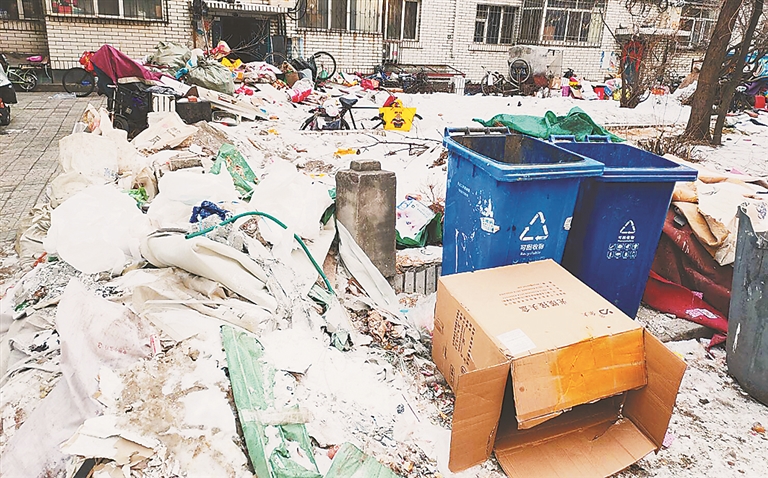 生活报讯 (记者李威兵文/摄) 22日,哈尔滨市民通过本报热线反映,哈市南岗区文君花园小区E栋楼下有垃圾已堆积数月,一直无人清理。现在垃圾堆约一米高,已开始从花坛外溢,快要堵到单元门口了。负责该小区物业管理的文君花园物业工作人员表示,自来水施工全部完工后,将立即清理。