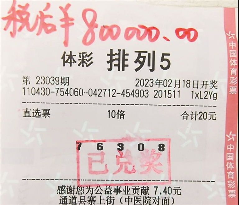生活报讯 (尚熹) 日前,怀化市一位小伙,投注20元,对“76308”进行了10倍投注,喜中排列5游戏第23039期10注一等奖,总奖金100万元。