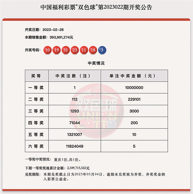 一等奖中出1注,单注奖金为1000万元。中奖情况:重庆1注。二等奖中出112注,单注中奖金额22万余元。六等奖中出1182万余注。