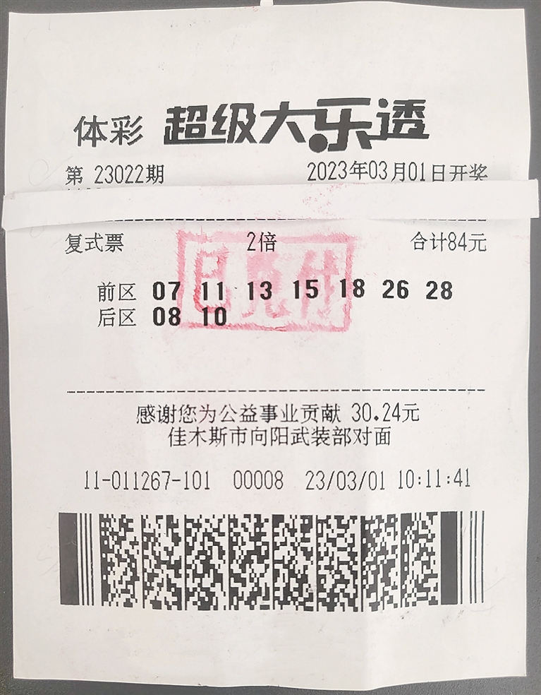3月1日,体彩超级大乐透第23022期开奖,前区开出号码“07、11、15、26、28”,后区开出号码“08、10”。本期全国开出5注一等奖。G先生中奖的彩票是一张投注额84元的2倍投注“7+2”复式票,单票总奖金1438万余元。大奖出自佳木斯市向阳区胜利路一建楼2号门市。
