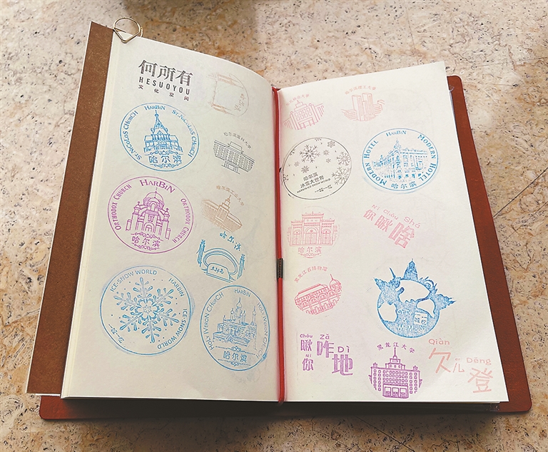 在中央大街66号2楼,记者偶遇了何所有书店。在左手边最里面的阅读区,一张阅读桌上,竹筐内摆放着各种别致的印章,憨态可掬的动物把手印章印下的是群力音乐长廊的大雪人;古堡把手的深绿色印章,印下的是松浦洋行的旧址缩影……不一会儿,地标性建筑的印章,已经填满了记者的两页印章本。