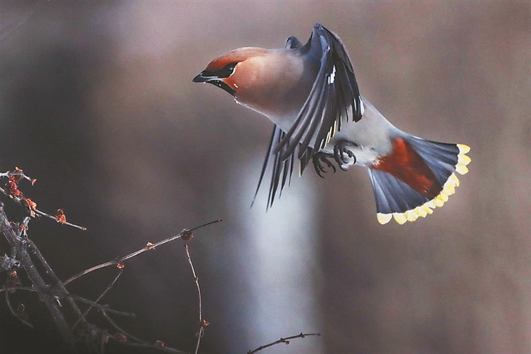 近日,东宁市率宾广场内,上千只小太平鸟在此驻足停留,引起市民围观。这些小精灵在树枝间嬉戏打闹,啄食花楸树上红红的浆果。它们时而站立枝头,远远望去犹如一朵朵绽放的绒花;时而飞向蓝天,为春天增加了无限生机。