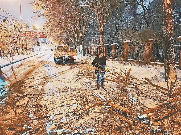 2021年11月,一场罕见的冻雨灾害袭击了冰城。张红负责养护的三合路上的数千棵果树不同程度地受到了冻害。“我们必须及时清理,要不树木会被冻坏。小树恢复快,老树可能会恢复不了。”张红告诉记者,“干活的时候没注意,凌晨4点到家,一脱鞋才发现袜子都粘脚上了。”