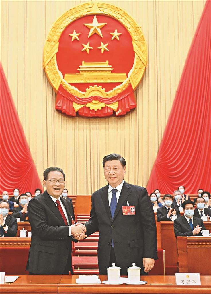 3月11日,十四届全国人大一次会议在北京人民大会堂举行第四次全体会议,根据国家主席习近平的提名,经过投票表决,决定李强为中华人民共和国国务院总理。这是习近平同李强握手。 新华社记者 李学仁 摄