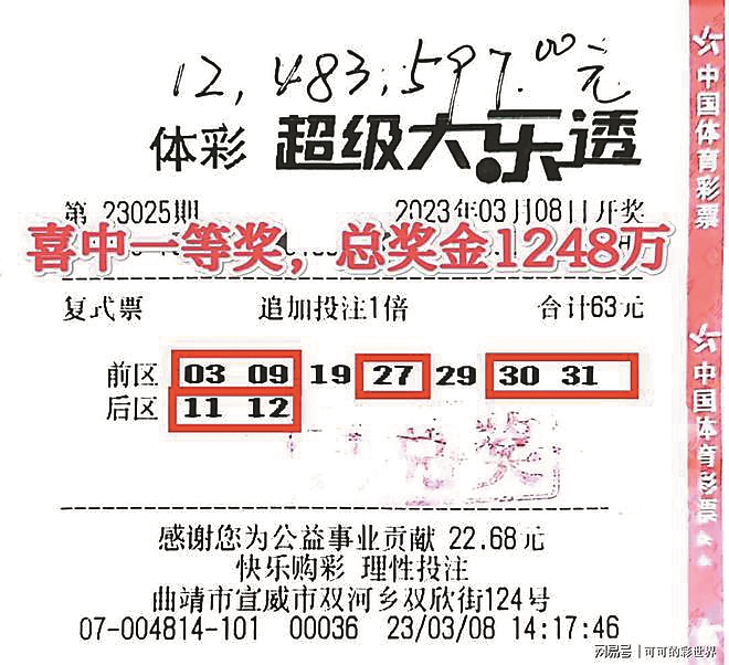 生活报讯 (一兵) 8日,云南曲靖一位购彩者在大乐透第23025期开奖中成功擒获1注追加一等奖,单票总奖金高达1248万元。