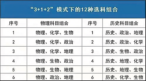 答:选择考科目理论上有12种组合,考生须根据自身兴趣、志向、优势和高等学校招生要求以及普通高中办学条件选择,具体组合如上图。