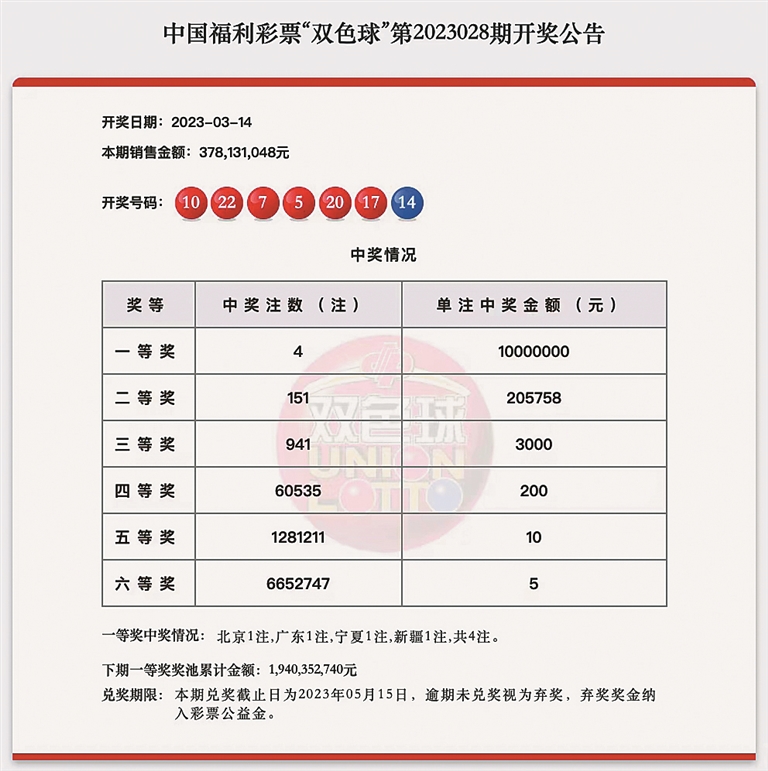 3月14日晚,中国福利彩票双色球游戏第2023028期开奖。本期双色球开奖号码为5 7 10 17 20 22 14。一等奖中出4注,单注奖金为1000万元。