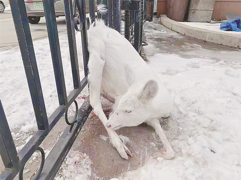 当日15时许,民警接报称有野生动物被困。经民警查看发现,被困的竟是一只白色狍子,其卡在栅栏中间,腿部有很深的伤口。民警先对狍子进行了安抚,然后绕到身后将狍子抱住。随后,林草局工作人员将狍子成功救出。