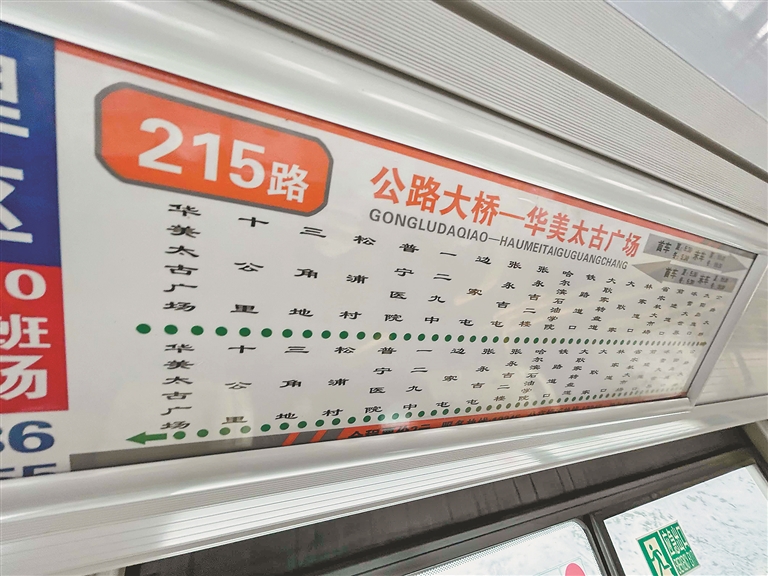 16日8时5分,生活报记者在松北区省农机大市场公交站台等待近一个小时,才坐上215路公交车,该车行驶至华美上城小区停止。记者发现,该车内外站牌信息不一致,车内站牌显示“由公路大桥至华美太古广场”,挡风玻璃上标牌显示“哈药路临时公交首末站至华美上城小区”。