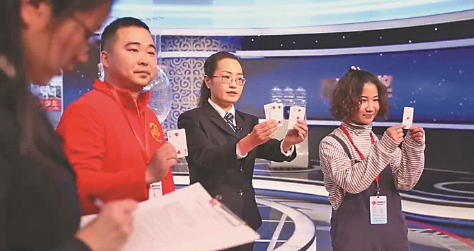 在公证员的监督下,以抽取扑克牌扣牌的方式选取当日开奖用球。然后,在公证员的全程监督下,完成取球、拆封球箱、装球。