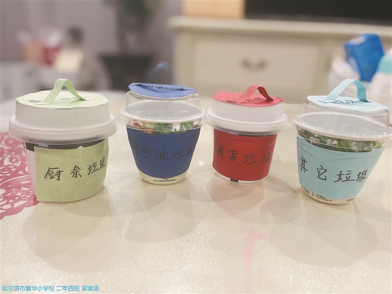 今天教大家怎样用喝完的酸奶盒、彩色卡纸做一套简易的分类垃圾桶。先选出四色卡纸,裁剪成适合的尺寸,然后在卡纸上写好分类垃圾的名字贴在酸奶外包装盒上,再做几个彩色小桶盖和把手,一组简易的分类垃圾桶就制作完成啦。可以把日常生活中的小件垃圾分类扔在里面,欢迎同学们一起动手,跟我学着做一做吧!