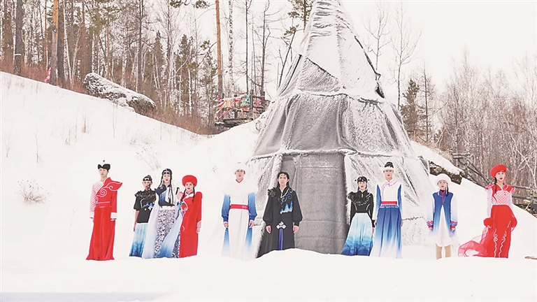 悠扬的鄂伦春曲调响起,白雪与山林间,一群身着各式鄂伦春文化服饰的模特踏雪而行……再现的鄂伦春人山林生活场景,与模特们绚丽的“民族风”服饰交织在一起,让冰雪与民族文化完美融合。这是一场特殊的走秀,也是龙江冰雪多元化魅力大赏。