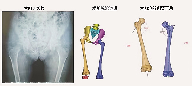 曲敬教授带领团队为其制定了详细的手术计划,利用3D影像电脑模拟小美的真实骨骼情况,精准测量颈干角及前倾角的数据,双侧均需手术矫正,但患儿左侧髋关节疼痛明显,经过与家长的讨论研究,决定先行左侧髋关节手术治疗。