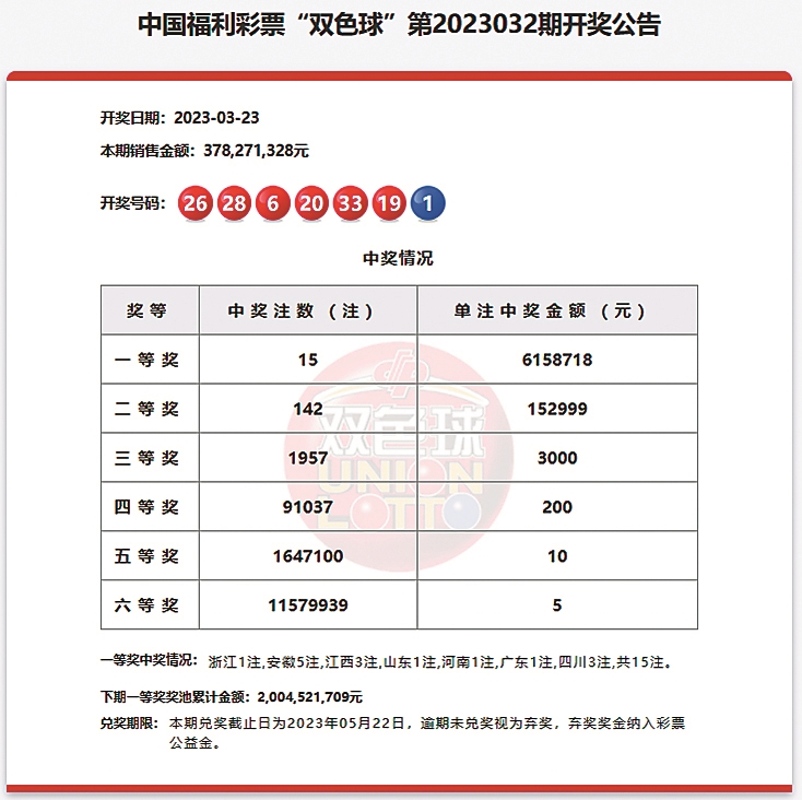 中奖情况:浙江1注,安徽5注,江西3注,山东1注,河南1注,广东1注,四川3注;二等奖中出142注,单注中奖金额15万余元。六等奖中出1157万余注。本期销量3.78亿元,筹集公益金1.36亿元。下期一等奖奖池累计金额20.04亿元。