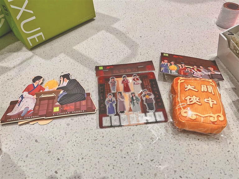 这家奈雪的茶门口,佟掌柜和白展堂两人在门口“相迎”。走进店内,无论是商品橱窗,还是店内海报,都有同福客栈各位小伙伴的身影,甚至连店里送的周边都带着他们。“我们的周边已经快送完了,大家都很喜欢,买的人特别多。”店员一边和记者介绍,一边在为一位购买《武林外传》系列饮料的客人打包。“我们店用过很多主题,《武林外传》是相对比较受欢迎的,很经典,顾客都很喜欢。”为热爱买单,既是致敬经典也是致敬曾经的青春。