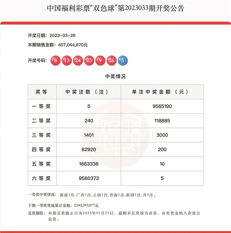 一等奖中出5注,单注奖金为956万余元。中奖情况:湖南1注,广西1注,云南1注,青海1注,新疆1注。二等奖中出240注,单注中奖金额11万余元。六等奖中出958万余注。
