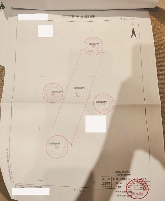 王先生拿出建厂与土地审批的所有手续。记者看到,王先生手中有正规审批手续,在原野村辖区内,0.7780公顷的集体农用地转为建设用地,并附有勘界图纸。图纸上明确标明王先生建厂用的这块地的位置,这块地并不是正南正北的,是斜着的,图纸上有多部门的盖章。
