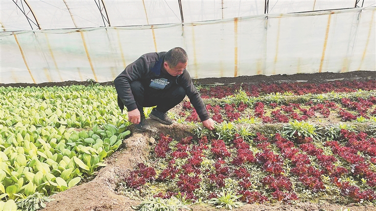 在红星蔬菜园区,记者看到,大棚里一派忙碌景象,油麦菜、紫叶生菜、油菜、苦苣长势喜人。记者走进一处大棚,室内温度高达40℃左右,里面全是水汽。“四月初,这第一茬地产叶菜就能上市了,一个大棚能出3000多斤。”赵德奎用手掌测量着油菜的高度,兴奋地介绍,他承包的蔬菜大棚,每个棚一年能出6茬菜,收入可观。这个大棚是三层膜,每增加一层膜室温会提高2℃以上,叶菜的长势会更好。在赵德奎家隔壁,村民任大哥家的油麦菜长势也不错。任大哥告诉记者,他对自己种植的几棚蔬菜非常有信心,因为品质好,一定能卖个好价钱。