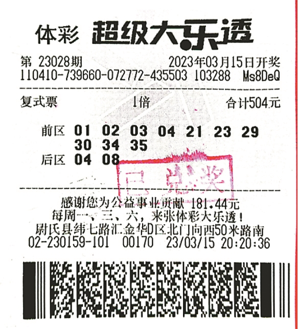 生活报讯 (于正) 3月15日,体彩超级大乐透第23028期开奖,河南省一位购彩者中了体彩超级大乐透二等奖1注,单注奖金299559元。票面显示,这张中奖票不仅中了1注二等奖,还中了25注五等奖,100注八等奖,100注九等奖,共计中奖309059元。