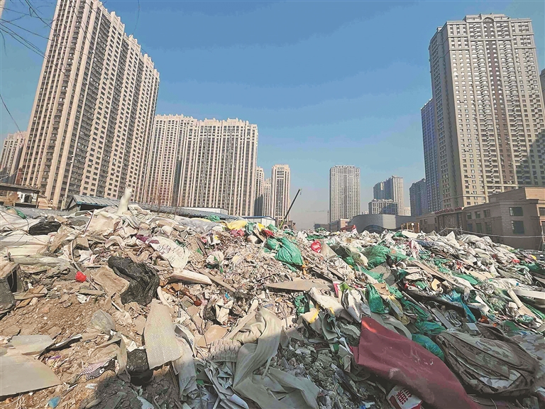 3月31日上午,生活报帮办记者在现场看到,宝宇环球港小区附近的一块空地上有一处蓝色围挡,里面堆放着很多垃圾,一辆蓝色货车在围挡内卸完垃圾后离开现场。随后又有一名自称是物业工作人员的人,将垃圾桶内的垃圾倒出后离开了。记者注意到,此处堆放的大多为建筑垃圾,也有部分生活垃圾,严重影响周边环境。据环球港小区业主刘女士介绍,2019年进户时,这里的垃圾就存在,天气热的时候窗户都不敢开,希望相关部门尽快处理。据另一名居民李女士介绍,这里是物业的垃圾回收点,业主多次向有关部门反映,也没解决问题。