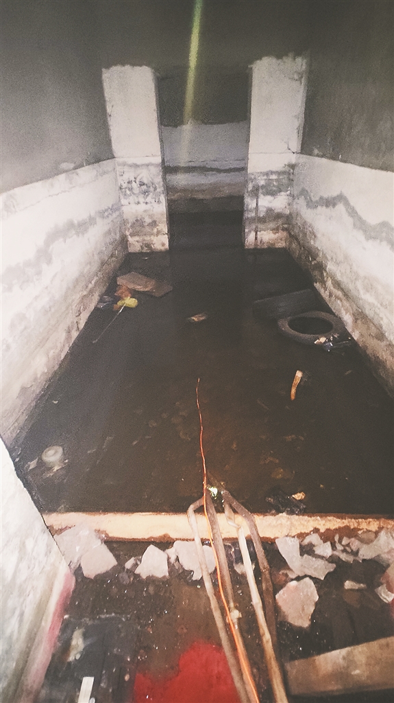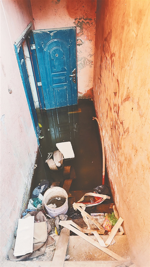 记者来到13号楼1号地下室发现,入口台阶处的墙体已发霉且部分脱落,一处墙缝中有水流出,门口的积水已有5厘米左右深。“屋里的积水更深,导致漏水点都不好找。平时我们都得穿着水靴水裤进去抽水。”赵女士表示,该楼其他地下室的漏水情况更严重,3号、4号地下室门口的积水有近10厘米深,屋里也全是水,杂物漂浮在水面,由于长期浸泡杂物,水质很浑浊。“已经持续近十个月了,不仅地下室不能使用,我们也担心地下室长期浸泡在水里,是否会对楼体安全造成影响,地下室的墙体已出现大面积脱落的现象。”居民孙女士说。