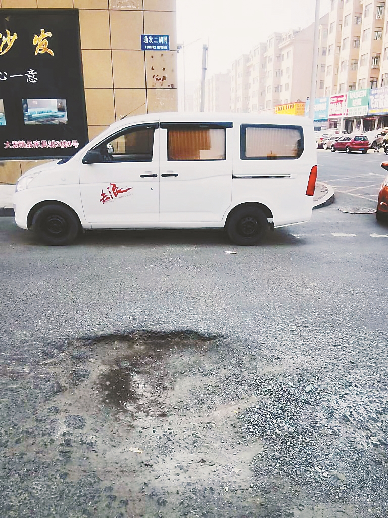 近日,记者来到现场看到,通发街88号门前形成了一个长约3米、深约20厘米的大坑,几乎占据了半个车道,途经此处的车辆和行人纷纷绕行,一些底盘较低的车辆由此经过还会发出剐蹭的声音。记者此后又来到不远处的通发二胡同,这里也有一个直径约2米、深约30厘米的大坑,由于此处正临街口,很多转向进来的车辆很容易进入坑内。