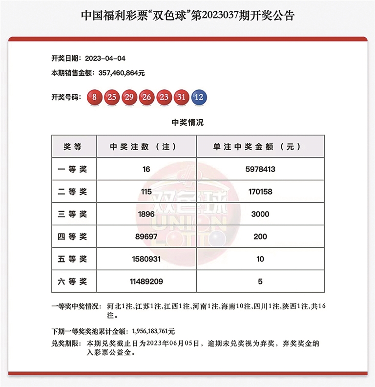 4月4日晚,中国福利彩票双色球游戏第2023037期开奖,本期双色球开奖号码为8、23、25、26、29、31、12。一等奖中出16注,单注奖金为597万余元。中奖情况:河北1注、江苏1注、江西1注、河南1注、海南10注、四川1注、陕西1注。