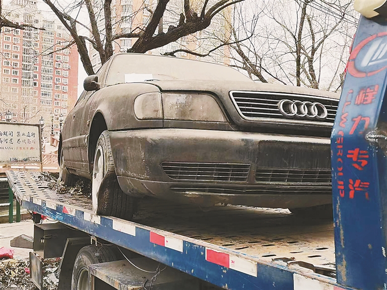还有一辆无牌黑色奥迪,车身布满灰尘,左转向灯和左后视镜破损,后备箱大面积掉漆生锈,车底满是树叶、垃圾。民警张贴通知单后依旧无人认领,附近居民表示该车已经停了五六年,但没人认识车主。交警当场将车辆拖走。