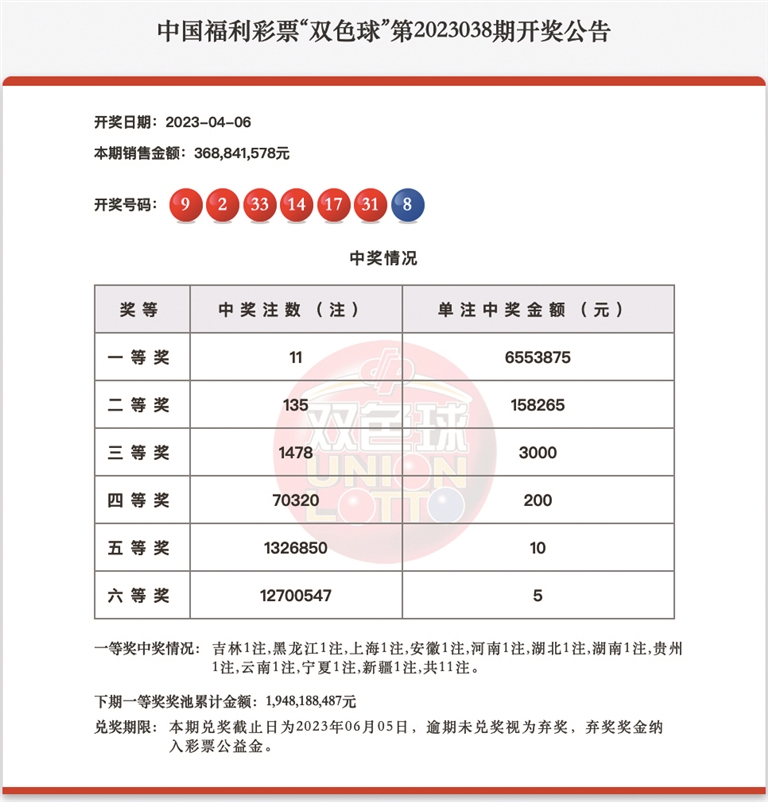 双色球开奖,4月6日晚,中国福利彩票双色球游戏第2023038期开奖,本期双色球开奖号码为2 9 14 17 31 33 8。