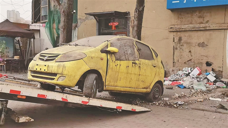 10日10时许,交警顾乡大队二中队民警来到铁顺街,发现一辆长期停放的“僵尸车”——一辆黄色小型长安轿车,车牌号为吉J22V6*。这辆车刚好卡在两棵直径40厘米左右的大树中间,方向盘没了,主驾驶位置车窗玻璃被塑料布和胶带代替,车身满是尘土,车内除了杂物外,还有一条附近居民常喂食的中华田园犬。附近居民说:“这车是之前修配厂扔在这里的,已经停了五六年了,原先有好几辆,现在就剩这辆黄色长安了。”