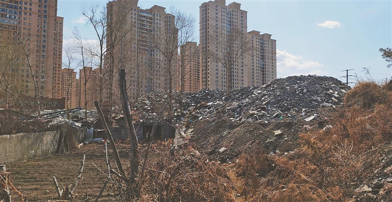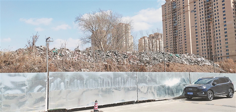 生活报讯 (帮办记者李威兵文/摄)12日,市民通过本报热线反映,哈市道里区群力第五大道璞悦湾小区门前空地,被人偷卸了大量建筑垃圾。因为垃圾堆起很高,而且就在小区居民出行通道旁,非常影响周边环境。该小区居民表示,这些垃圾是3月份被人偷卸在这里的,到现在已经一个月了,一直无人清理。