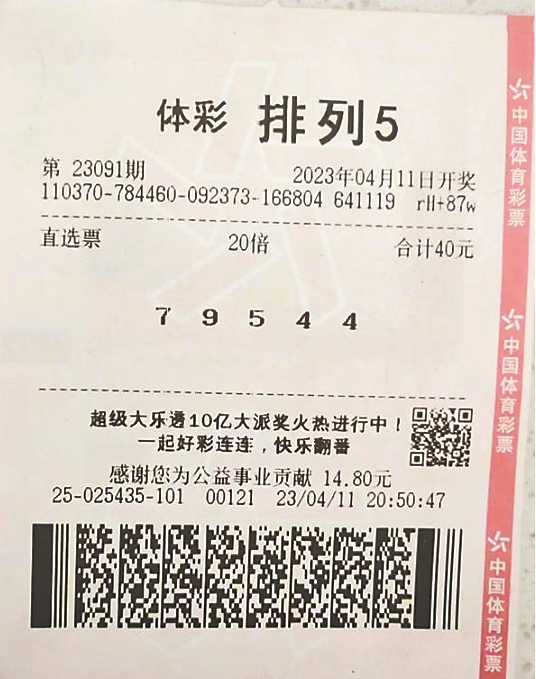 第二天上午,一位身着白色衣服的小伙子来到体彩中心办理兑奖手续。这张彩票购买时间是4月11日20时50分,共一注单式票,20倍的投注。说起这张票,孟先生(化姓)说可以用“惊险”来形容,险些就错过出票时间。原来,孟先生一直有购买排列型彩票游戏的习惯,当天忙活完个人事情后,才想起今天的彩票没买,眼看要到截止销售时间了,便匆匆来到离家最近的体彩店,经过一番粗略研究后,孟先生分别购买了排列3、排列5的游戏票,票打印出来的时间距离截止销售仅剩10分钟。孟先生表示,自己经常研究号码,谈不上有什么经验,之前基本都是2至4倍地投,就在两个月前,自己研究购买的一注排列5彩票前面的三个数都对,最后两个数也对,就是顺序与开奖号码颠倒了。自从那次以后,自己就像有预感,感觉迟早会中奖,便提高了投注的倍数,不过购彩也很理性,20的倍投已到极限。孟先生说,当期还购买了排列3游戏,进行了10倍投,也中了10注一等奖。