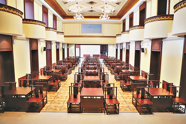 近百年的俄式建筑里,采用传统的中式风格,这已然让哈尔滨相声百乐会新剧场足够亮眼。再配上古风古韵的深红色实木桌椅,“相声园子”那股原汁原味的劲儿便扑面而来。据悉,相声百乐会新剧场曾是原秋林洋行俱乐部,在这里举办过俄罗斯交响音乐会、大型俄侨联谊会等活动,当年红极一时。刘彤介绍,位于南岗核心商圈的新剧场,交通便利、文化味儿浓。剧场大堂上下两层视野开阔,舞台配备现代化灯光音响和LED大屏,舒适程度与观看效果更佳。