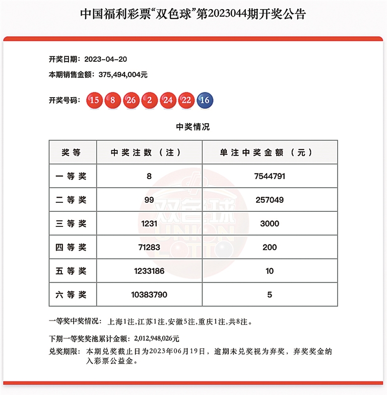 4月20日晚,中国福利彩票双色球游戏第2023044期开奖,本期双色球开奖号码为2、8、15、22、24、26、16。一等奖中出8注,单注奖金为754万余元。中奖情况:上海1注、江苏1注、安徽5注、重庆1注。