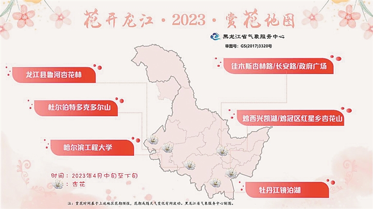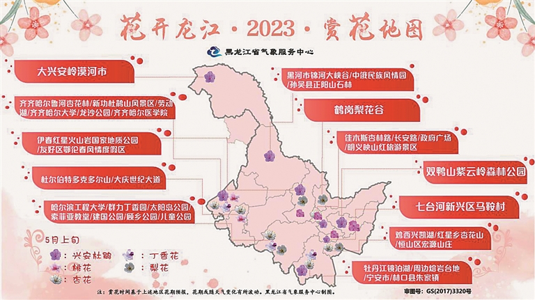 生活报讯 (记者李威兵) 进入谷雨节气,龙江大地的色彩逐渐丰富起来,春风抚绿了杨柳,百花绽满了枝头。黑龙江省气象服务中心根据各花期物候特征预报制作出了黑龙江省赏花时间轴,为您提供近段时间的赏花进程图。