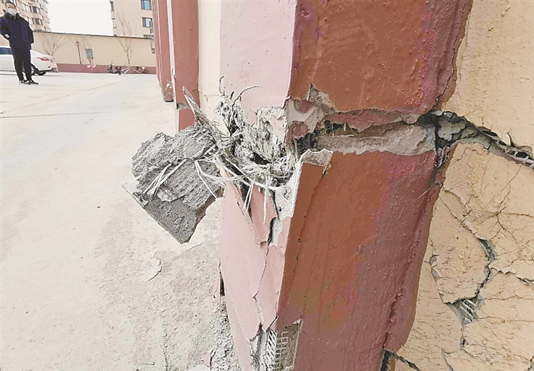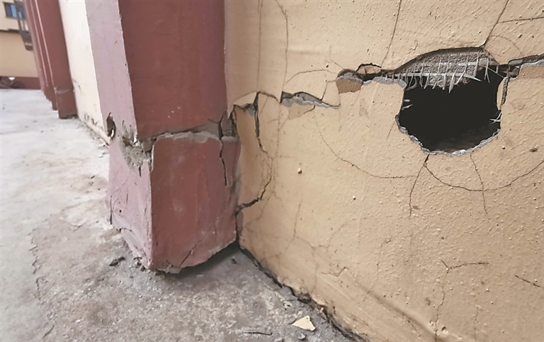 21日,记者来到鹤岗市绥滨县工商行家属楼,据居民代表王先生介绍,该楼分为南楼和北楼,1997年左右建成,2021年进行的改造,2022年居民就发现许多问题,“北楼面向小区院内一侧部分外墙下沉、裂纹;地面处墙面出现了空洞的现象,能够轻松地伸进一只手,几条裂痕从地面延伸到一楼窗台附近;有一根外墙水泥柱断裂。”