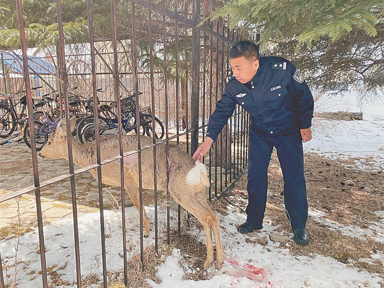 当日,呼中区公安局森保大队接到群众报警称:有一只狍子卡在了呼中镇秀中园对面的铁栅栏上,需要救助。森保大队立即组织警力赶到现场。民警发现这只野生狍子的身体卡在了铁栅栏的间隙中,无法脱身,且被卡部位的皮毛大片脱落,有血迹出现。