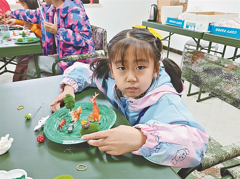 体验课上,孩子们边回忆,边发挥想象。有的在草地上画出了一条条石头路,有的给草地粘上了树木和小动物,有的在小房子旁边“种”上了塔头草……一件件作品就像一个个微缩景观,想象丰富、内容丰富、色彩丰富。“做这个作品的时候,我发现要从内往外粘道具,这样不会破坏整体结构。”赵子伊有条有理地说道。“通过做手工,我意识到要去爱护小动物。”继红小学盖宗瑜说道。