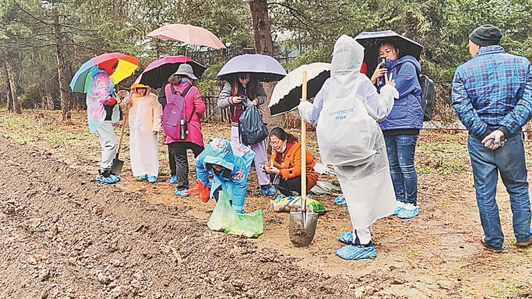 有的孩子本想认真地把毛葱根儿拍进土里,但一激动用力过猛,直接给葱拍裂纹了。有的孩子怕毛葱跟土壤接触的不够紧密,把土踩得特别实,估计毛葱破土而出有点难……这些可都是错误的示范哦。经过工作人员的及时纠正,孩子们最终收获了种植毛葱的经验。在种土豆的时候,更是唤起了不少家长的童年记忆,在给孩子讲解种土豆的过程时,自己也实地教起来,带着孩子们开启了体验版的农耕生活。