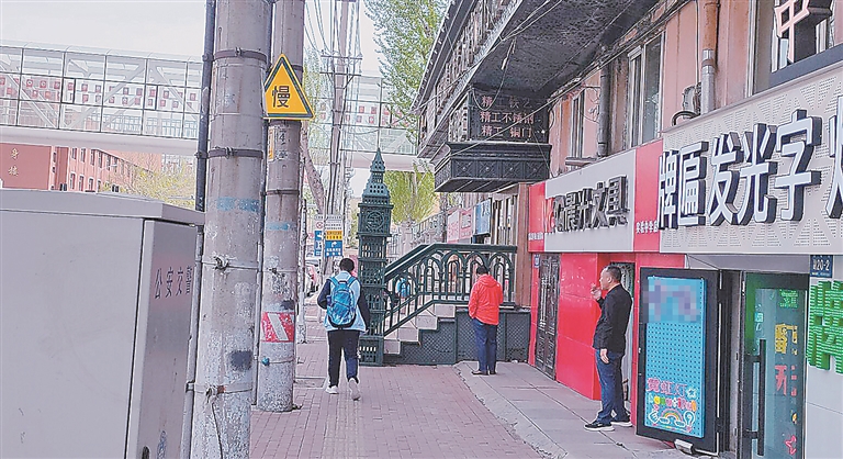 生活报讯 (记者李威兵文/摄) 5日,有市民向生活报记者反映,哈市南岗区海城街20号一家铁艺商铺门前建了一个大台阶,堵住了人行道。
